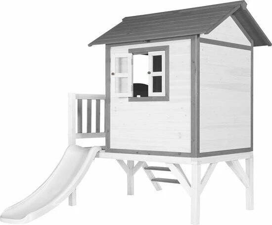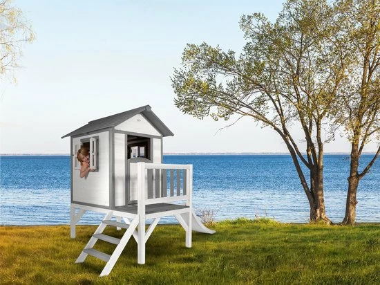 Klimmen op de trap, over de veranda en snel weer naar beneden van de glijbaan? Dat kan met het Lodge XL Speelhuis Klassiek van AXI. Hoe vaker ze naar beneden glijden, hoe leuker ze het vinden! Lodge XL Speelhuis is een leuk basis huisje welke in iedere tuin past. Het speelhuisje uit de Beach serie van AXI is uitgevoerd in moderne grijs/witte kleuren welke perfect in iedere hedendaagse tuin passen. Lodge XL speelhuis heeft een platformhoogte van 57 cm en is uitgevoerd met een kleine glijbaan van 118 cm lang. Aan de zijkanten heeft het ramen die eenvoudig geopend kunnen worden. De stoere halve deur heeft een brievenbus waar kinderen post doorheen kunnen gooien als ze postbodetje spelen. Het trapje en glijbaan kunnen zowel links als rechts aan het speelhuis worden bevestigd.