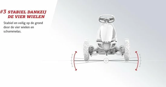 Dankzij de vier wielen heeft de BERG Rally een uitstekende stabiliteit. Hierdoor kan je snel, scherp en veilig door de bochten. Daarnaast is kantelen vrijwel onmogelijk doordat er geen kantelpunt ontstaat.
