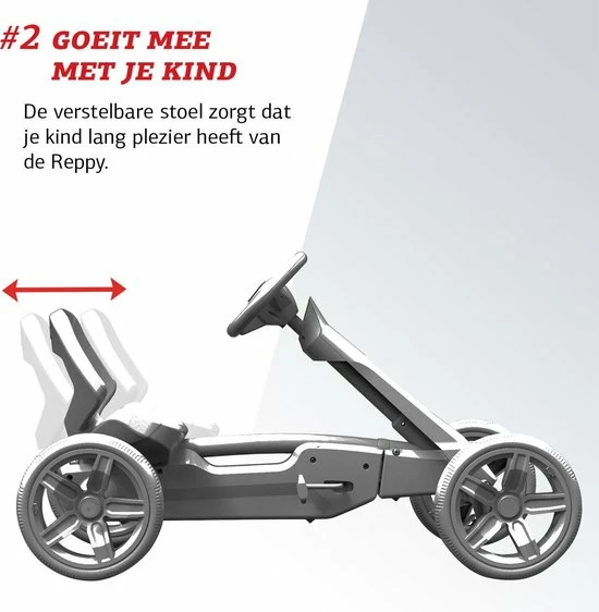 Groeit mee met je kindDe kuipstoel van de Reppy is makkelijk te verstellen door de draaiknop in de stoel. Hier is geen gereedschap bij nodig! Door de lage zitpositie is het niet nodig om het stuur te verstellen. In welke stoelpositie een kind ook zit, het stuur is altijd goed bereikbaar. De Reppy is gemaakt voor kinderen van 2,5 tot 6 jaar.