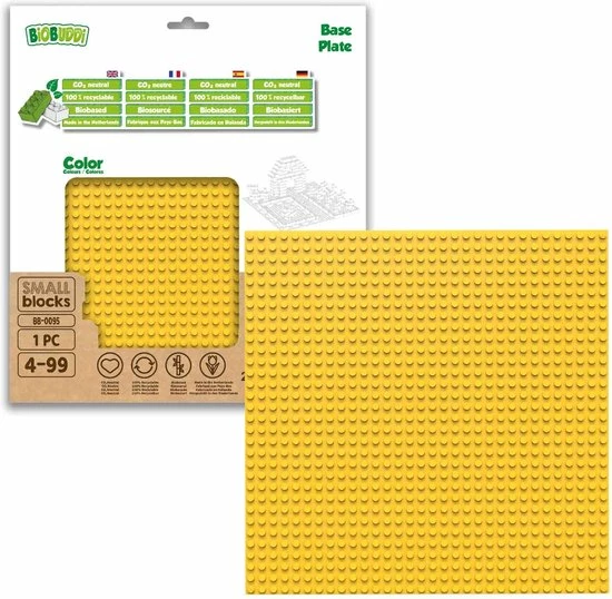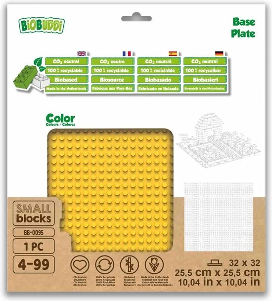 Het gehele productieproces van het speelgoedbord is daardoor CO2 neutraal, het materiaal is ook net zo duurzaam in gebruik als de platen van de andere bekende merken. Het mooiste van het BiOBUDDi-materiaal is dat het ook hergebruikt kan worden en dit gebeurt al, als het uiteindelijk verbrand wordt heeft het ook een positieve CO2-uitstoot. Het assortiment heeft 7 verschillende kleuren. De platen zijn allemaal exact even groot: 25 * 25 cm. De platen zijn te gebruiken met grotere BiOBUDDi-blokken en met kleinere blokken van de bekende merken.