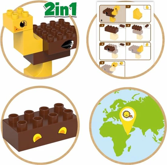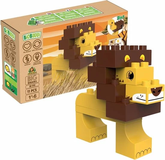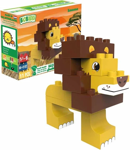 Blokkenset met bouwblokken gemaakt van hernieuwbaar materiaal! Het materiaal is erg vergelijkbaar met kunststof en is gemaakt van afval van de suikerriet industrie. Breng de warme savanne tot leven en bouw een stoere leeuw of een supersnelle struisvogel. Combineer de Savanne set met de andere dieren van de Wildlife reeks zoals de olifant of de giraf (apart verkrijgbaar). De speelgoedblokken hebben verschillende kleuren en maten. Milieuvriendelijk geproduceerd Materiaal: Polyethyleen Inhoud: 11 bouwblokken (geel, bruin), bouwinstructies.