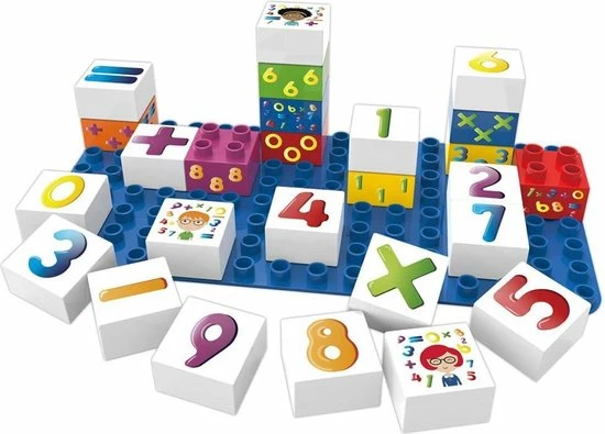 - Een bouwdoos met een bouwplaat en 26 blokjes met nummers en rekentekens.