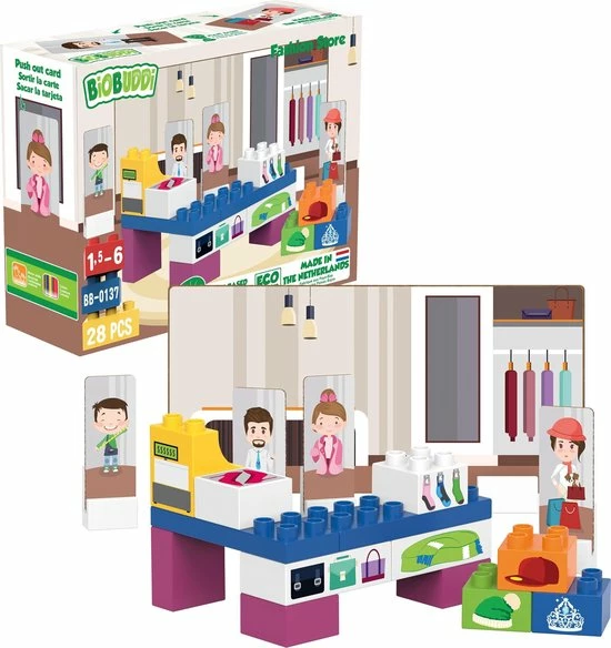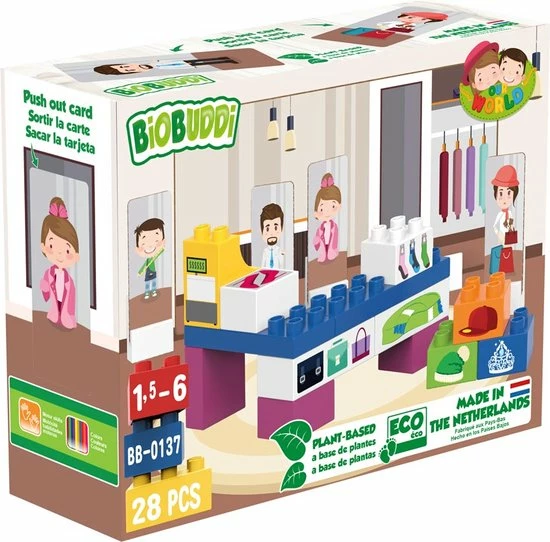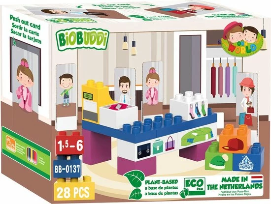 Bouw je eigen Fashion store, verkoop de mooiste kleren van de stad en wie weet lopen ze binnenkort met jouw kleren over de Catwalk. De leerzame en leuke speelset Fashion store bevat 28 bouwblokken, 5 uitdrukkaartjes met nieuwe personages, zoals de getalenteerde stylist en zijn klanten, en een gloednieuw achtergrond. Alle kaartjes zijn verwerkt in de 100% recyclebare verpakking! Onze bouwblokken zijn speciaal gemaakt door kinderen van 1.5 tot 6 jaar, gemaakt van resten uit de suikerriet plant. De blokken zijn milieuvriendelijk, recyclebaar, duurzaam en ook uitwisselbaar met andere merken. Het helpt kinderen met het ontwikkelen van zowel motorische, cognitieve en creatieve vaardigheden tijdens het spelen. Met BiOBUDDi laat je zien dat je verantwoord omgaat met de planeet en toekomst van de aarde. Daarnaast staat BiOBUDDi garant voor uren veilig en verantwoord speelplezier.