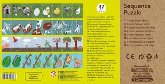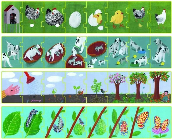 Elke set bevat 32 stuks met vier verschillende levenscycli: planten, bijen en honing, de rups die verandert in een vlinder, van het ei tot de kip.