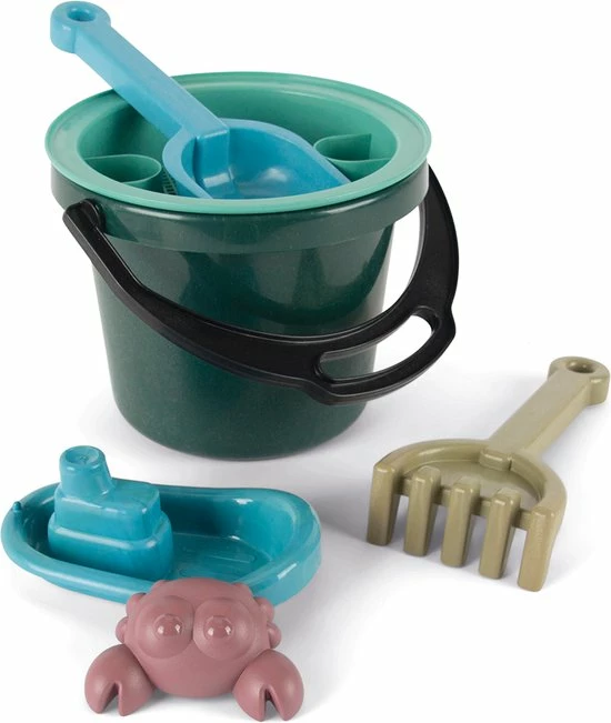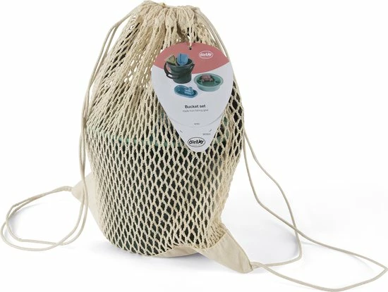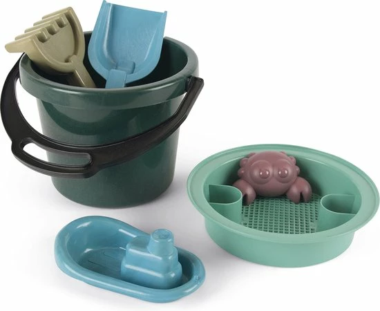 Een mooie emmerset met een zeef, boot en schepje. De set biedt veel mogelijkheden voor zintuiglijk spel en het verkennen van zand en water in de natuur.