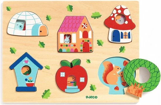 Een houten Djeco vormenpuzzel met als thema ‘huis’. Puzzel coucou heeft 6 grote houten stukken en is geschikt voor kinderen vanaf 18 maanden, een mooie houten puzzel om zelf te leren puzzelen. Een houten puzzel met 6 dieren in hun huisje. Elk puzzelstuk geeft een doorkijkje in het huis. Kijk eens wie er in de appel woont, en wie woont er in de iglo?