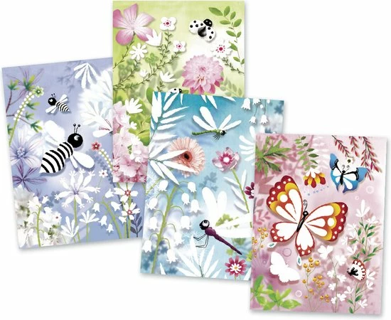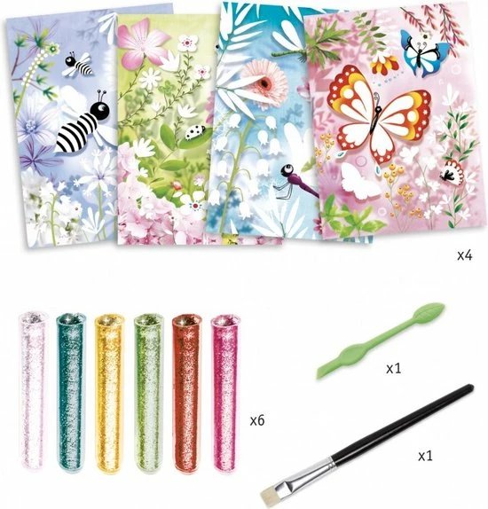 Het verhaal van Eric of het klein insectenboek komt tot leven in deze wonderlijke schilderijtjes! Met dit knutselpakket van Djeco voor jongens en meisjes in de leeftijd van 7 tot 13 jaar krijgen kinderen de kans om hun eerste professionele schilderijen te leren maken. Met het gereedschap schrap je de randjes weg waarna je de glittertjes precies over de lijntjes verdeeld, even blazen en voìla!