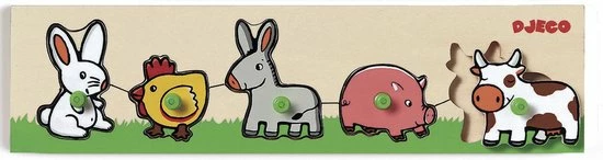 Een leuk puzzelplankje met 5 boerderijdieren van Djeco. Door de knopjes, kunnen kinderen de stukjes al snel goed vasthouden. Heel geschikt als eerste puzzel!