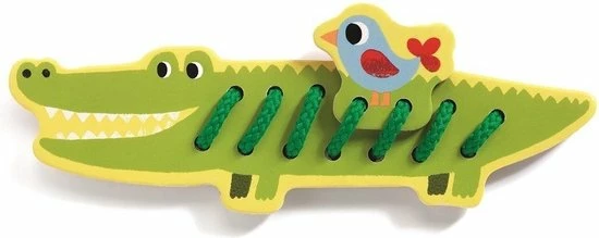 Leer rijgen met deze houten dieren van het Franse speelgoedmerk DJECO. Deze houten rijgkaarten hebben vrolijke afbeeldingen van een leeuw, een krokodil, een zebra en een tijger. Het grappige snoetje van de leeuw moet je er zelf op rijgen. Een creatief klusje dat goed is voor de ontwikkeling van de fijne motoriek. De set bestaat uit 4 dieren uit de jungle, een leeuwesnoet en een klein vogeltje en 4 rijgveters in verschillende kleuren.