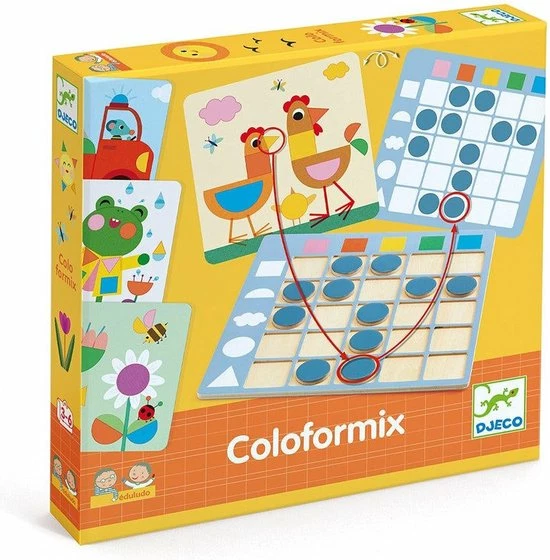 Welke vorm heeft de snavel van de kip? Met het educatieve spel “Coloformix” van het merk Djeco leren kinderen spelenderwijs kleuren en vormen herkennen.
