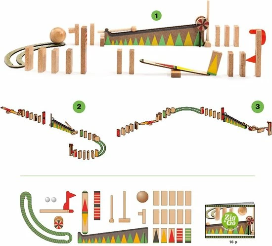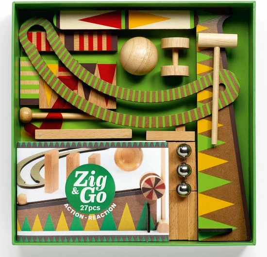 Zig & Go is een combinatie van domino en een knikkerbaan. Het is een houten actie- en reactiespel waar met verschillende onderdelen een parcours gebouwd kan worden. Samen veroorzaken ze een kettingreactie waardoor de ene na de andere verassing ontstaat. Het spel is niet alleen leuk maar ook erg mooi vormgegeven! Het spel is geschikt voor jong en oud, en hebt er uren lang speel plezier van.
