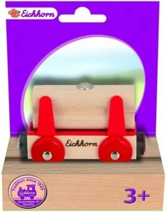 Eichhorn wagon.br /br /wagon met houtlading (2-delig). Erg leuke aanvulling op je trein! Werkt met magneten.br /br /materiaal: houtbr /lengte: 8 cmbr /bijzonderheden: geschikt voor kinderen vanaf 3 jaar.