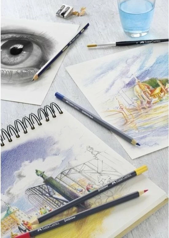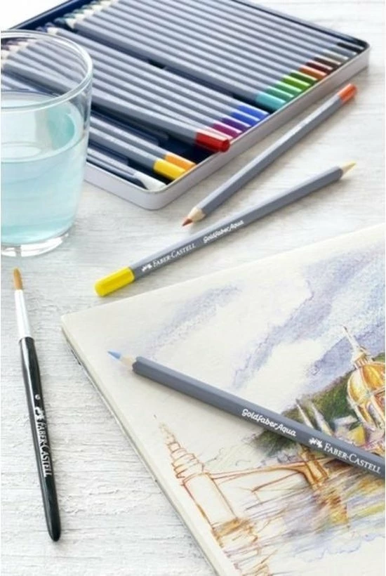 De Goldfaber Aqua aquarelpotloden overtuigen door hun zachte en intense kleurweergave en uitstekende kleurglans met droge of natte technieken. Alle droge tekentechnieken van kleurpotloden kunnen met deze aquarelpotloden worden gebruikt. Met een nat penseel kunnen prachtige aquarelschilderijen worden getoverd tot een motief of patroon dat is ontworpen met de Goldfaber Aqua.