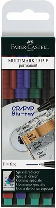 De MULTIMARK marker schrijft op praktisch alle oppervlakken. Met ge?ntegreerde gum voor vrijwel alle gladde oppervlakken, zoals CD / DVD / Blu-ray. Extreem lichtecht. Uitstekende hechting op de meeste ondergronden. Lijnbreedte F. Etui met 4 stuks.