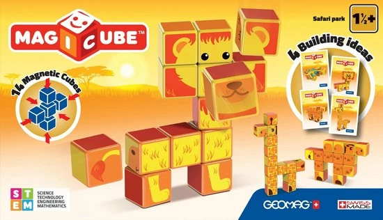 De Geomag MagiCube is speciaal ontwikkeld voor de allerkleinsten. Met deze set kunnen kinderen de klassieke kubus ontdekken. Deze set met dierenthema bestaat uit 14 magnetische blokjes waarmee je 4 verschillende Afrikaanse dieren kunt bouwen.