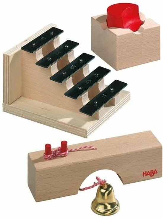 - 1 klanktrap, 1 brug met bel, 1 omkeerblok en 6 knikkers.