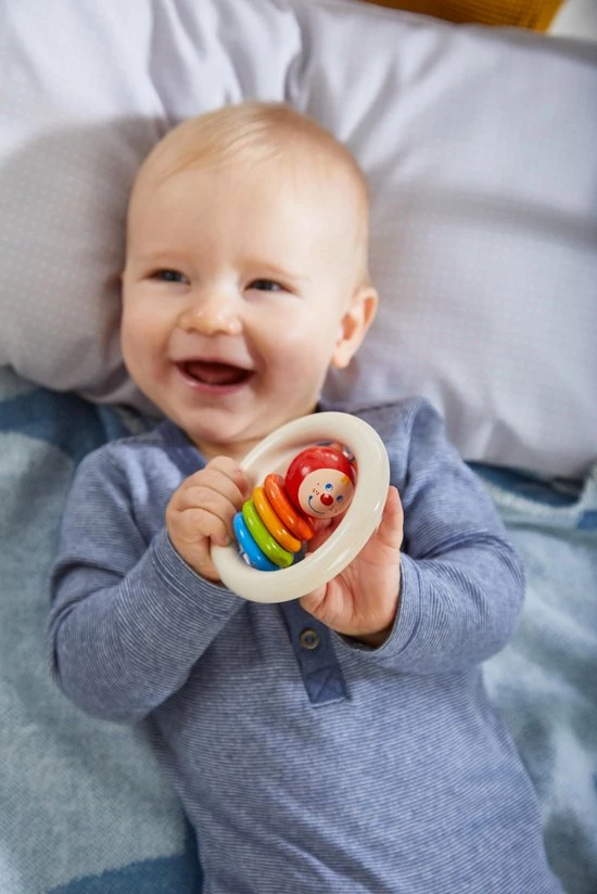 Deze robuuste houten rammelaar fascineert baby?s met zijn vrolijk grijnzende Kasperkop en leuke kleppereffect.