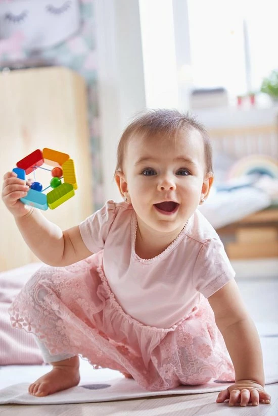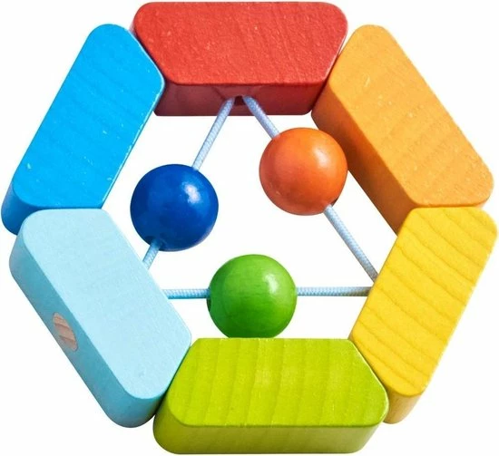 Deze robuuste houten rammelaar fascineert baby’s door zijn vrolijke kleuren en boeiende akoestische effecten.