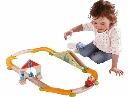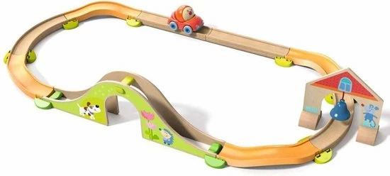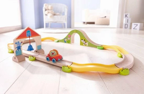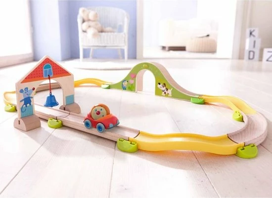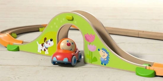 Kleur: meerkleurig Materiaal: beukenhout, multiplex en kunststof Slim kliksysteem Aanbevolen leeftijd: 2 – 8 jaar Levering bevat : 1 x brug 1 x boog met belletje 2 x rechte baan 2 x bocht 4 x golvende bocht 7 x verbindingsstuk 1 x rode cabrio 1 x bal Paul