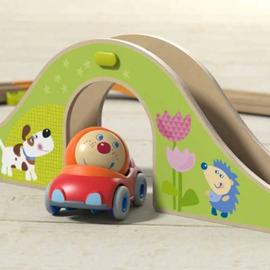De HABA Kullerb? ballenbaan Brugrally is een vrolijke speelgoedset met een schattige bal met zijn eigen auto’s. Het Kullerb? assortiment is speciaal ontworpen voor peuters die te jong zijn voor knikkerbanen en deze set bevat alle elementen die nodig zijn om een ??saaie dag om te toveren in een geweldige en leuke dag! En het beste van alles is dat de meeste elementen niet alleen prachtige kleuren hebben, maar ook ronde, vriendelijke vormen hebben, waardoor het spel met name ideaal is voor peuters! U kunt uw peuter helpen de ballenbaan op verschillende manieren op te stellen, verhalen te maken, hem of haar te helpen zijn of haar motoriek en hand-oog co?rdinatie te verbeteren en hem of haar met verkeersregels kennis te laten maken. Levering bevat 1 brug, 1 boog met een belletje, 4 rechte banen, 2 bochten, 4 golvende banen, 7 verbindingsstukken, 1 rode cabriolet en 1 houten bal Paul.
