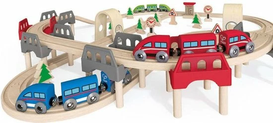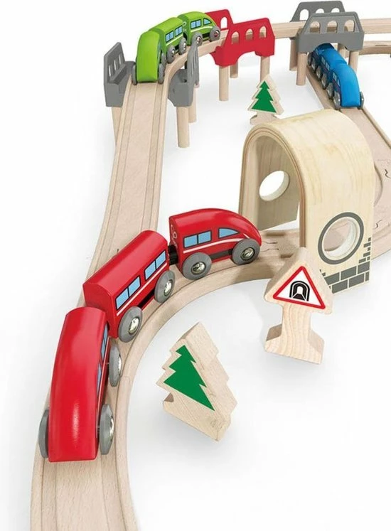 Afmetingen: 90 x 67 x 10 cm (L x B x H) Materiaal: hout, metaal, PE, PP en magneten Kindveilige materialen met niet giftige afwerking Bevat 85 onderdelen Met 3 treinen, bruggen, tunnels en meer Versierd met felle kleuren en een natuurlijke afwerking Speel op een nieuw niveau met deze ultieme set Helpt bij de ontwikkeling van hand-oog coördinatie, creativiteit en verbeelding Verken je creativiteit en boots echte situaties na Geschikt om steeds andere treinbanen te maken Aanbevolen leeftijd: 3+ jaar