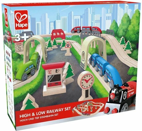 Speel op een nieuw niveau met de ultieme Hoog & Laag treinset van Hape! De set bevat 3 sneltreinen, bruggen, tunnels, bomen, borden en meer. De trein helpt bij het ontwikkelen van hand-oog coördinatie, creativiteit en verbeelding. Deze hoog & laag treinset, gemaakt van stevig hout met felle kleuren en een natuurlijke afwerking, gaat lang mee. Hij is geschikt voor kinderen van 3 jaar en ouder. Levering bevat 85 onderdelen.