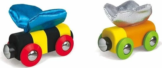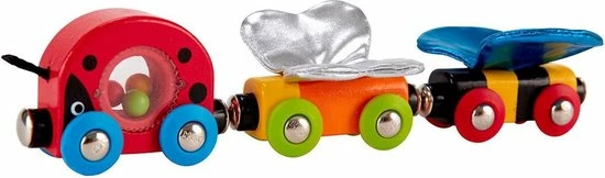 Zoem en fladder naar je volgende bestemming aan boord van deze trein vol insectenvriendjes. De rammelende lieveheersbeestje-wagon stuurt de trein met zijn bij- en vlindervriendje in zijn spoor. Schud de lieveheersbeestje-wagon en het wordt tevens een rammelaar! De bij- en vlinderwagon zijn voorzien van stoffen vleugels om lekker te kreuken.