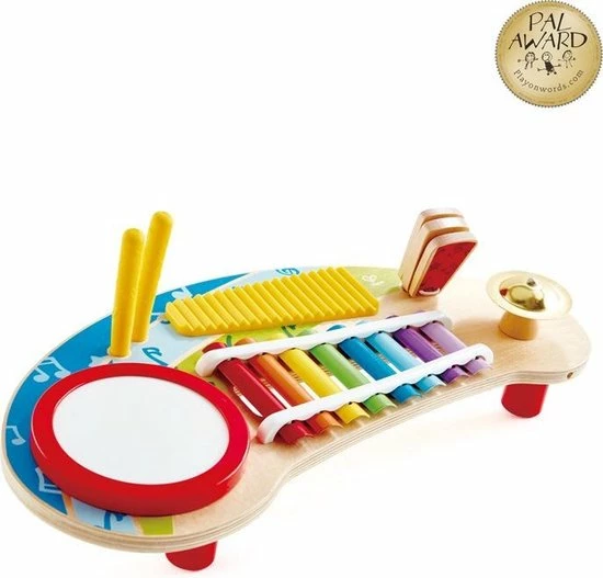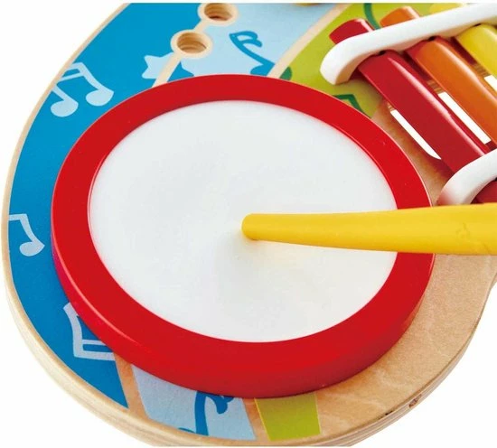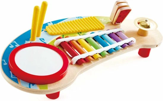 Speel de sterren van de hemel met deze mooie miniband. In het toestel zitten verschillende instrumenten zoals, een xylofoon, een trommel, een bel en een ratel. Jij bent een stoere eensmansband met deze coole multi-instrumententafel.