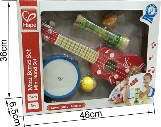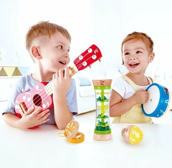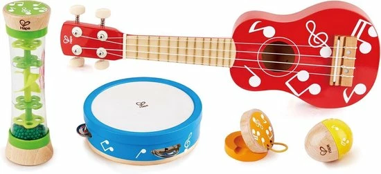 Maak jouw eigen liedjes met deze set van Hape. In de set zitten een gitaar, een tamboerijn, een regenmaker, een ei en een castagnette. Laat aan iedereen horen welke nummers jij allemaal kunt spelen.