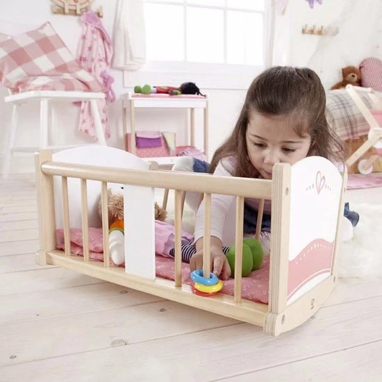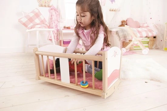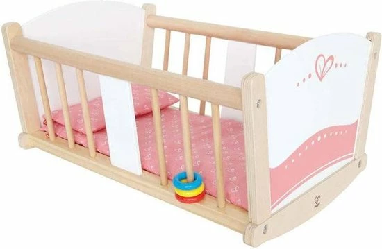 Wieg de pop in slaap in de houten poppenwieg. Inclusief beddengoed.