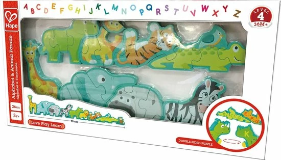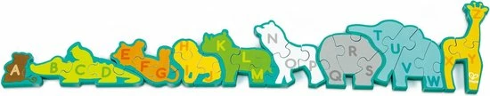 Deze grote houten puzzel heeft zesentwintig dubbelzijdige stukken. Aan de ene kant staan dieren afgebeeld en aan de andere kant het alfabet. De puzzel kan rechtop staan op een tafel. Hiermee leert je kind spelenderwijs het alfabet!