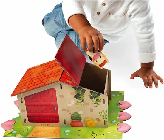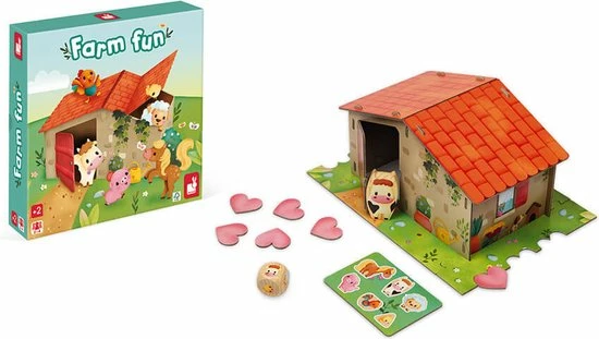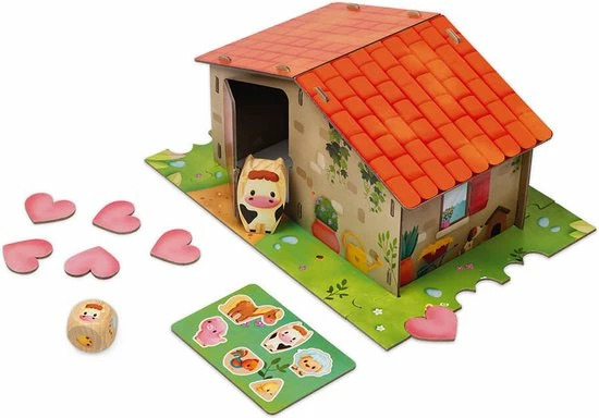 De boerderijdieren hebben een leuke verrassing voor kinderen in petto! Ze verstopten zich in hun mooie schuilplaats, het is aan de spelers om elk dier blind te vinden, met alleen de aanraking! Om daar te komen zullen de deelnemers elkaar moeten helpen door te onthouden waar het te vinden dier verstopt zit. Je steekt je hand in de boerderij door de deur of het dak en elke keer dat je het juiste dier vindt, krijgt het team een ??hart dat ze op het bord kunnen plakken. Na 6 harten verkregen, is het spel gewonnen! Dit co?peratieve spel voor kinderen vanaf 2 jaar kan gespeeld worden door 2 tot 4 spelers. Het bevat 1 boerderij, 6 houten dieren, 6 hartenfiches, 1 herinneringskaart van de verschillende dieren om de kleintjes te helpen en 1 houten dobbelsteen. Een spel van tactiele herkenning en geheugen, ideaal om een ??eerste speelervaring te delen met peuters! Boerderij, kartonnen harten en kaarten, massief houten dieren en dobbelstenen Dit spel is FSC-gecertificeerd (hout uit duurzaam beheerde bossen).
