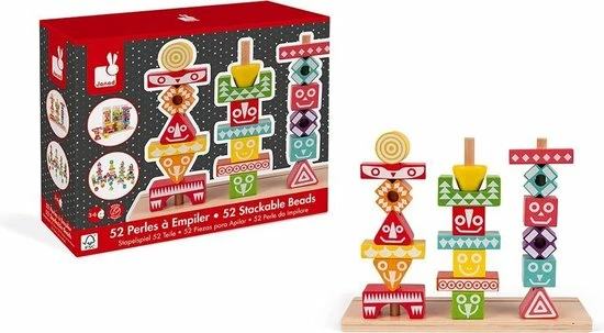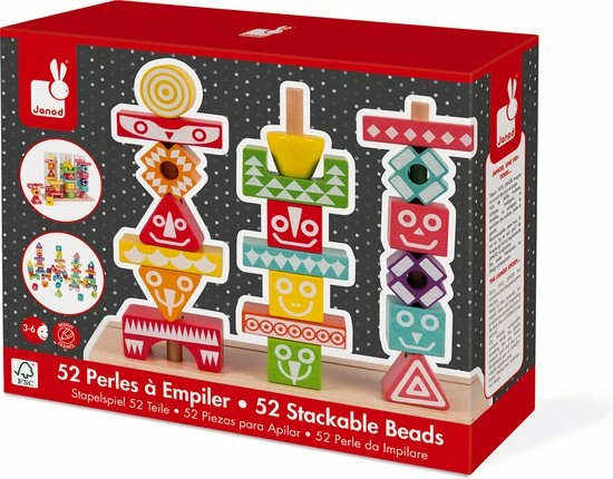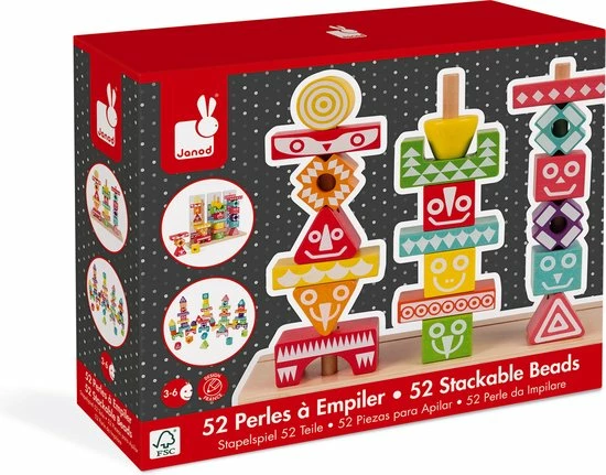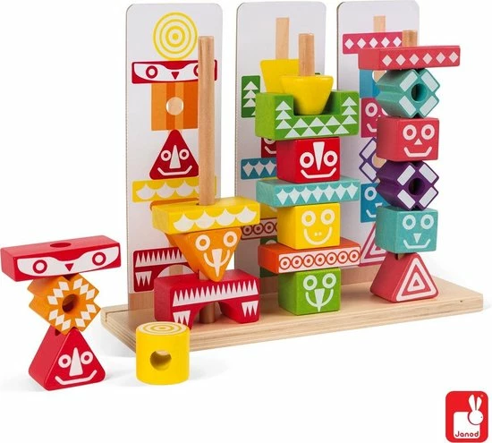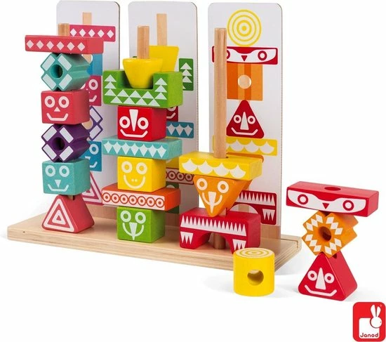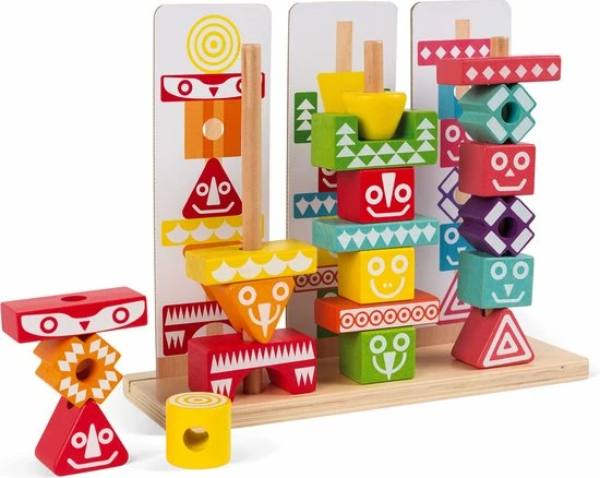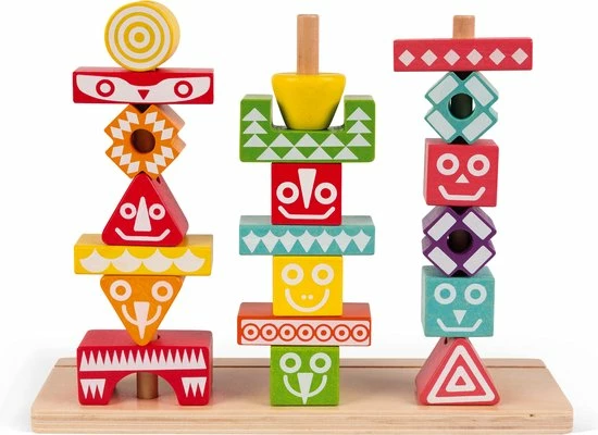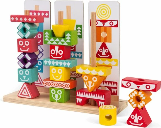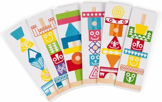 Leerspeelgoed van de serie I Wood: kleuren en vormen combineren. FSC-gecertificeerd. Waterverf. Geschikt voor kinderen van 3 tot 6 jaar. 52 stukjes om mee te stapelen. 6 dubbelzijdige gedrukte kaarten met voorbeelden om de totem na te bouwen.