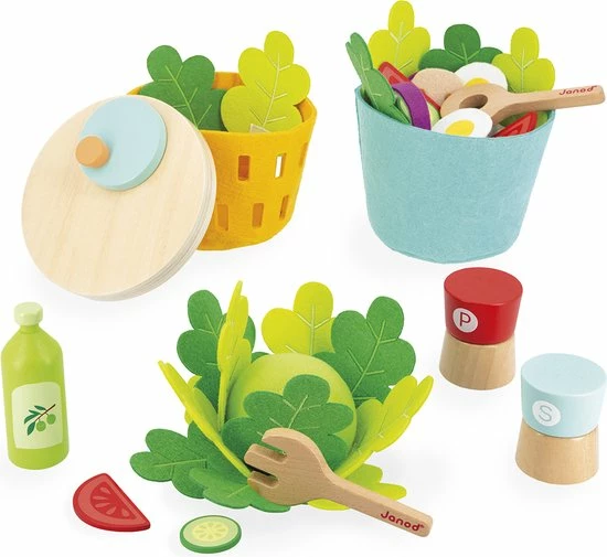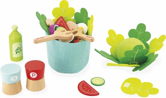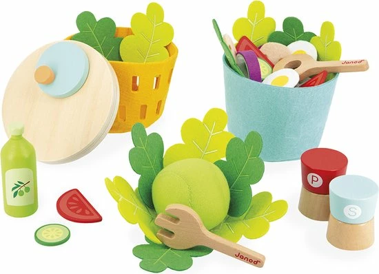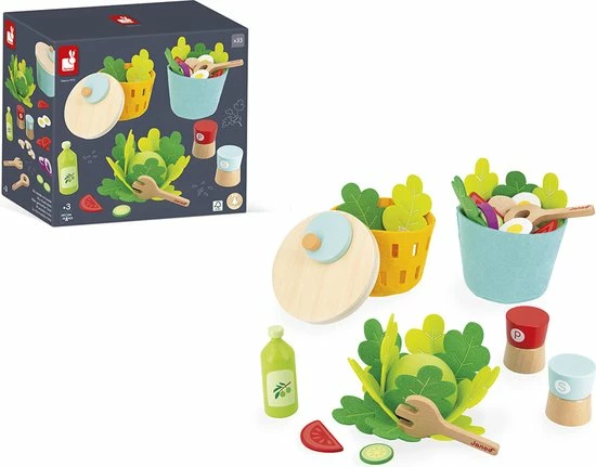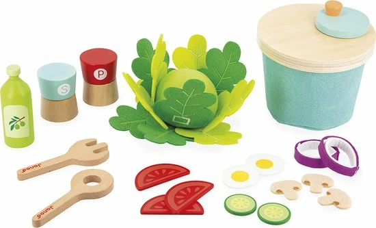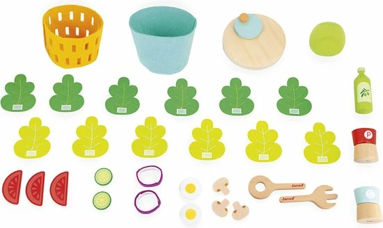 1 blaadje, 2 blaadjes? en de sla is ontbladerd! Eieren, uien, komkommers, tomaten, champignons, een snuifje zout en peper en een scheutje olijfolie voor een geslaagd recept! In totaal 33 accessoires in hout en vilt om de verbeelding te stimuleren. Speelgoed van FSCTM-hout. Imitatiespeelgoed voor kinderen vanaf 3 jaar.