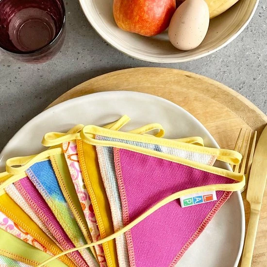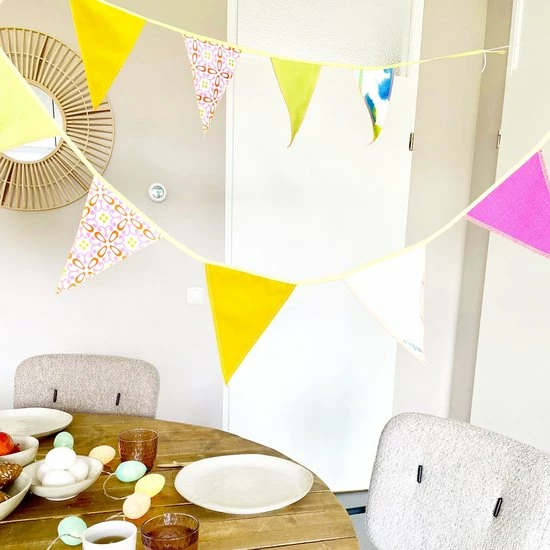 Van deze vrolijk gekleurde vlaggenlijn krijgen wij lentekriebels. Het geel van het zonnetje dat steeds vaker doorkomt, het groen dat overal weer tevoorschijn komt en het roze van de eerste bloemetjes. Deze stijlvolle en kleurrijke vlaggenlijn is gemaakt van kwalitatieve reststoffen die overblijven bij de gordijnproductie. Onze prachtige slingers van restmaterialen zijn uniek en gaan jaren mee. Door de mooie materialen is de vlaggenlijn niet alleen leuk voor een feestje maar ook als sfeervol woonaccessoire, bijvoorbeeld voor de kinderkamer. De vlaggenlijn bestaat uit 24 vlaggetjes, heeft een afmenting van 7,5 meter en zit in een mooi opbergzakje. De verpakking is ook gemaakt van reststoffen.