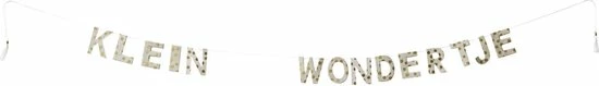 Gouden slinger met de tekst klein wondertje. Deze tekst slinger is gemaakt van lokta papier en is 1 meter lang. De letters van deze decoratieve slinger zijn 3 cm hoog. Leuk voor op de babykamer of als kraamcadeautje.