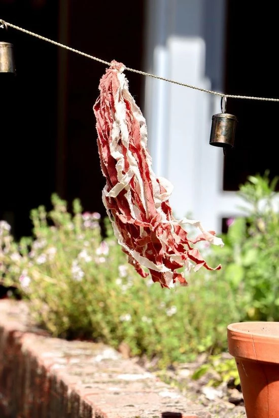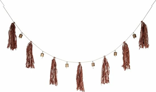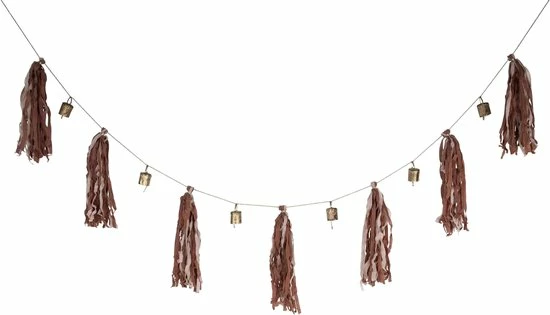 Deze vier-het-leven bohemian slinger, in roestbruin, met gerecycled katoen en belletjes is een gezellige aankleding in je interieur of in de tuin. Als de belletjes in de wind rinkelen komen je wensen uit.