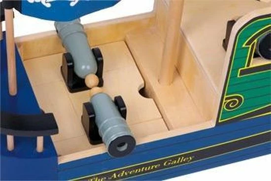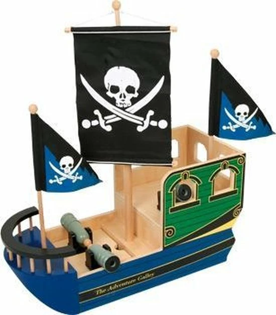 Dit houten piratenschip is de schrik van de oceanen. Uitgevoerd met drie grote zeilen met de bekende doodskoppen.