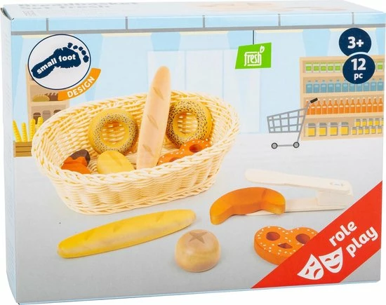Ontbijt is klaar! Deze set met gebakken producten, een geweven mand en bakkerstang zal indruk maken op jonge fijnproevers. Twee croissants, twee bagels, een tarwebroodje en een roggebroodje, twee stokbroodjes en twee pretzels vormen het perfecte ontbijt op deze ochtend. In een actief rollenspel kunnen kinderen eerst de producten in hun speelwinkel kopen en vervolgens op tafel plaatsen voor een gezellig ontbijt.