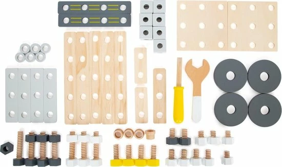 Het perfecte creatieve speelgoed voor jonge, ambitieuze monteurs! Met dit houten bouwpakket kunnen jonge knutselaars zich creatief uiten en hun eigen unieke constructies maken. Met perforaties, kubussen met schroefdraad, schroeven, houten schijven en moeren kunnen ze hun driedimensionale opbouw oefenen, en alle onderdelen kunnen goed in elkaar worden gezet met de sleutel en schroevendraaier. De hele set kan worden gesorteerd en netjes opgeborgen in de meegeleverde doos.