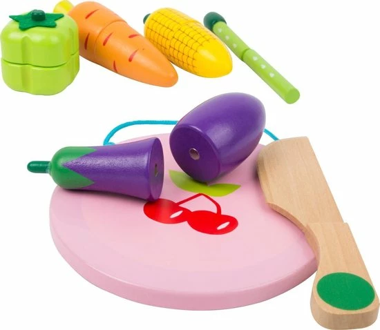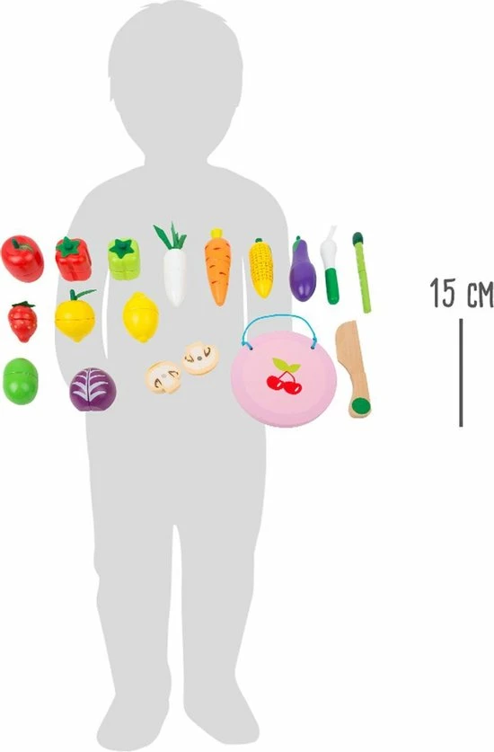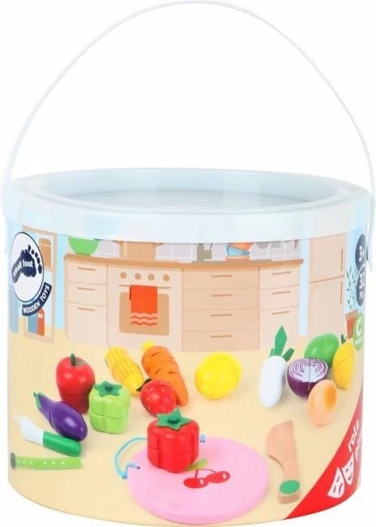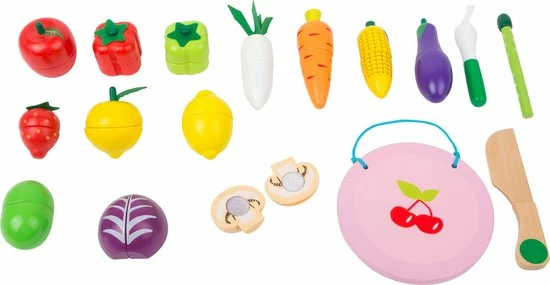Deze mix van fruit en groenten heeft veel te bieden. De verschillende soorten groenten en fruit zijn geverfd om er precies zo uit te zien als het echte, en worden samengehouden met magneten. Een aardappelschiller, een speelgoedschilmes en een houten bord zijn opgenomen als handige keukenhulpjes. Het is een smakelijke speeltijdervaring die ook creativiteit en fantasie?n bevordert. Ook ideaal voor onderweg! Het is een onmisbaar product voor de groente-en-fruitsector in speelwinkels.