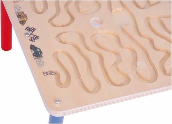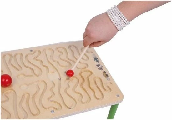 De doolhof in een plank van stevig multiplex bevordert een vooruitziende blik, overzicht en concentratie! Houd de lange sticks met magnetisch einde boven de tafel en probeer zo de bal door de doolhof te leiden.
