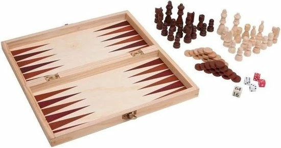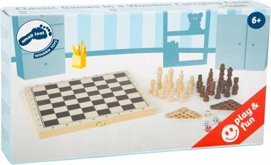 Deze leuke houten spellendoos bevat spellen zoals schaken, dammen en spellen met een dobbelsteen. Perfect voor een regenachtige spellenmiddag met veel afwisseling qua spellen.