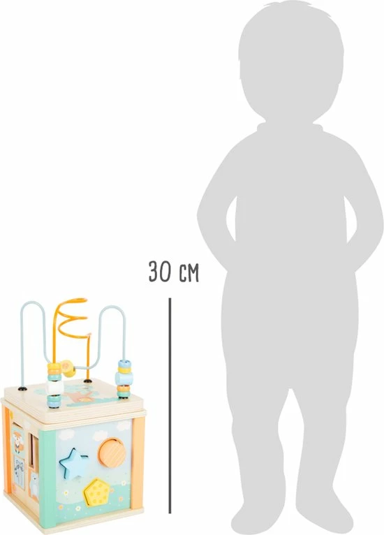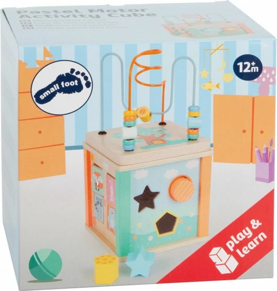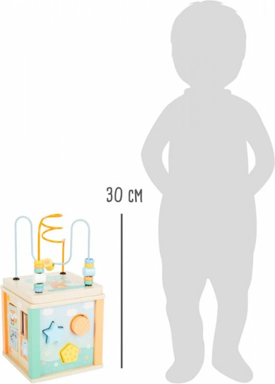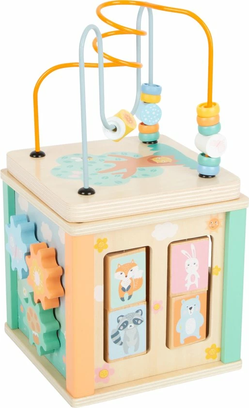 Stapel, duw, flap, draai! Deze houten kubus belooft zelfs de kleinste kinderen gevarieerd en leuk spel. Een kralenlabyrint, sorteerspel, vormpas- en duwspel en tandwielen bevorderen kleur- en vormherkenning en fijne motoriek. Trendy pastelkleuren, schattige dierenmotieven en speelse details maken deze kubus tot een absolute eye-catcher in de kinderkamer. Een ander groot voordeel is dat de deksel afneembaar is en ondersteboven in de kubus opgeborgen kan worden. Dit werkt erg ruimtebesparend!