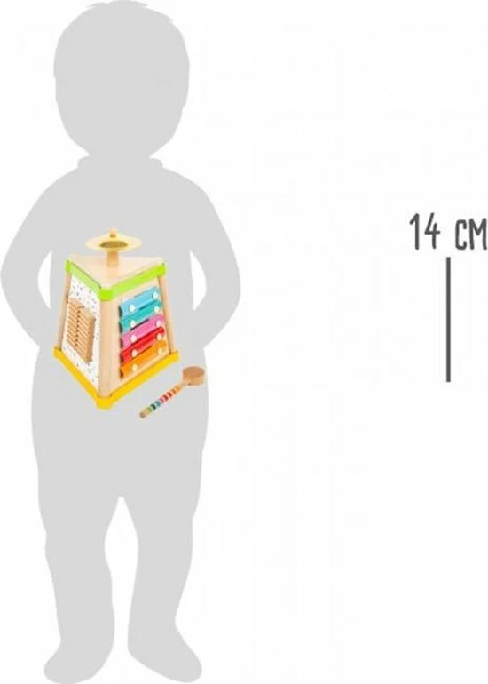 Muziek en tonen maken je blij! Deze felgekleurde muzikale driehoek van hout biedt kinderen aan zijn drie kanten allerlei mogelijkheden om muziek te maken. Of het nu gaat om de rammelaar, de bellen, de trommel of de mini-xylofoon, er is voor iedereen het juiste instrument!