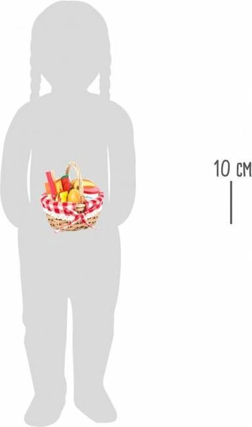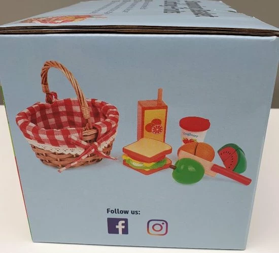 Kom op, we gaan picknicken! Deze geweven boodschappenmand staat vol met verse houten boodschappen. De 17-delige set bevat twee sneetjes brood, een plakje kaas, een tomaat, een saladeblad, een ei, een plakje watermeloen, een appel, een kopje yoghurt en een pakje drinken. De kinderen leren hoe ze met een mes moeten omgaan door het voedsel op een heel speelse manier door te snijden, omdat alle snijdbare boodschappen bij elkaar worden gehouden door klittenbandbevestigingen. Op deze manier kunnen kinderen winkelen zoals de volwassenen en echte dagelijkse situaties herhalen. Alle boodschappen worden vervolgens naar huis gedragen in de houten mand met handvat. Een perfecte aanvulling op de kinderkeuken en de speelgoedwinkel en een ideale metgezel bij elke poppenexcursie.
