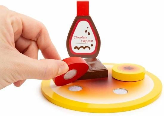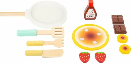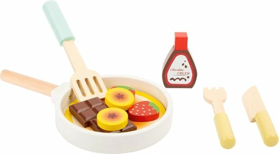 Vandaag eten we pannenkoeken! Met deze houten speelset kunnen zelfs de jongste koks lekkere crêpes en pannenkoeken bereiden in hun speelkeuken. Een spatel, saus en bestek maken deze set helemaal compleet. Een must-have voor de speelkeuken van elk kind!
