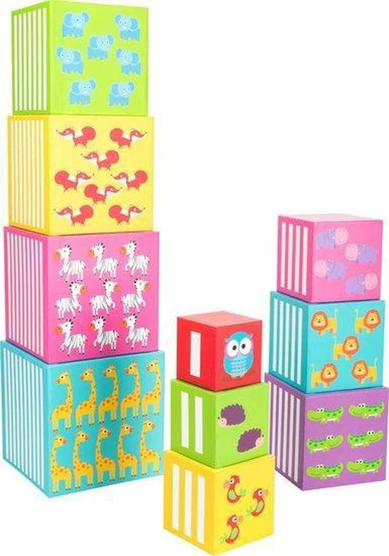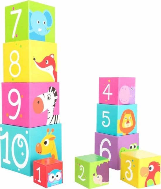 De zaken worden hier hoog opgestapeld! Deze vrolijke wilde dieren nodigen jonge bouwmeesters uit om hun stapelkunsten te laten zien. De tien kubussen gemaakt van stevig karton zijn bedrukt met grappige dieren en cijfers die kinderen op een speelse manier de cijfers leren kennen. Bij het stapelen trainen kinderen ook hun fijne motoriek en concentratie, zodat de toren niet meteen instort. Alle kubussen kunnen gemakkelijk in elkaar worden gestapeld.