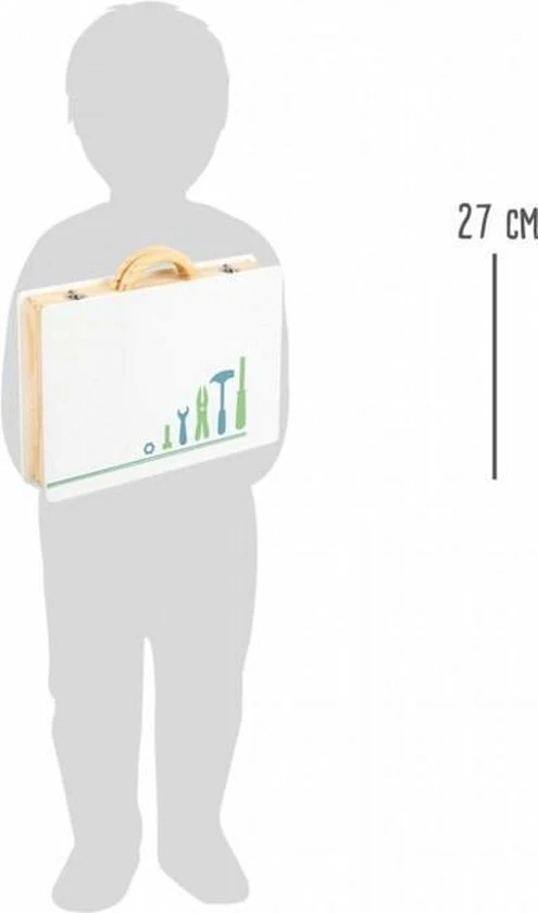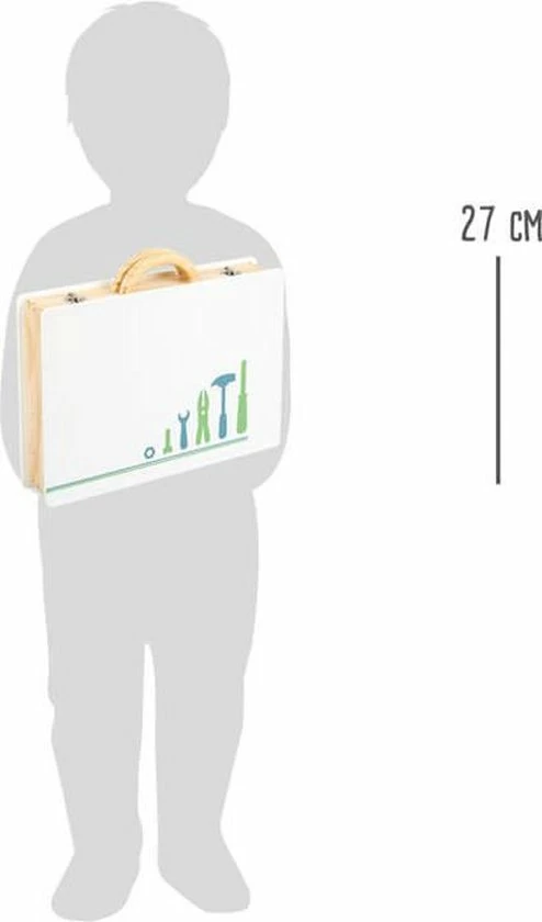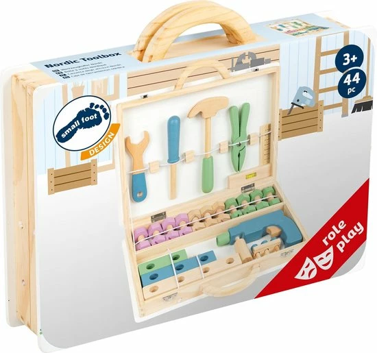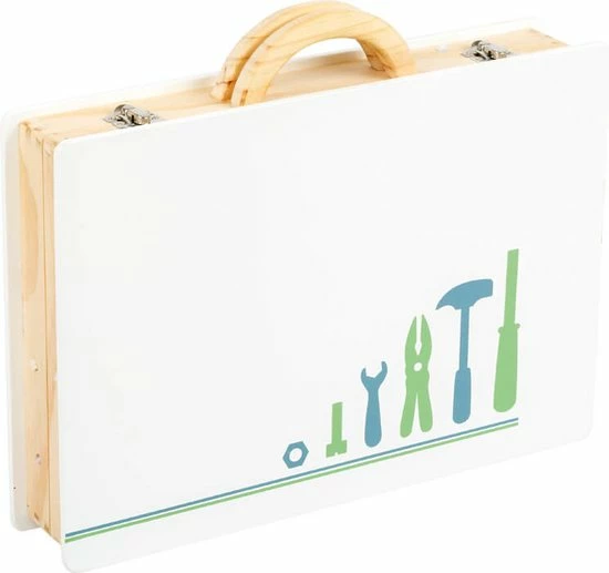 Nu kunnen de doe-het-zelf projecten echt van start gaan! Met deze houten gereedschapskist in Scandinavisch design worden jonge ambachtslieden echt professionals. De rijk gedetailleerde accessoires zoals een liniaal met geïntegreerde waterpas en een handige accuschroevendraaier met bits die met behulp van magneten kunnen worden verwisseld, voldoen aan al hun wensen! Inclusief 43-delig toebehoren bestaande uit 5 gereedschappen, 1 boor, 3 bits, 11 schroeven, 11 moeren, 11 moeren en 12 geperforeerde strips. Met de vergrendelingsclips kan alles veilig worden opgeborgen en met de houten draaggreep is deze gereedschapskist klaar voor jonge jongens en meisjes op het volgende thuisprojectstation.