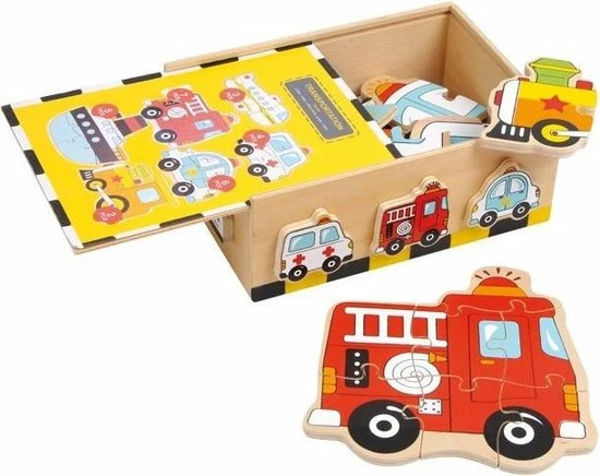 Leuke kleurrijke houten puzzel box met 6 verschillende voertuigen! De hoeveelheid onderdelen van de voertuigen verscheelt van 2 tot 7-delig. De houten box met schuifdeksel heeft aan de zijkanten geplaatste voorbeelden van de 6 voertuigen.